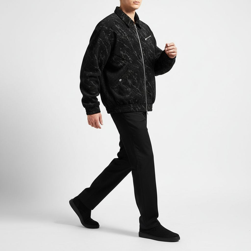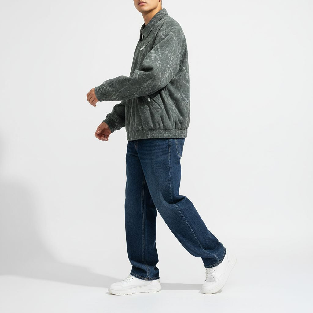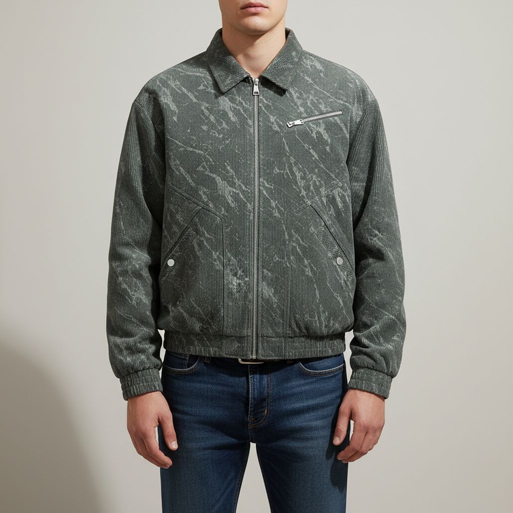 A mineral-marble finish brings creative contrast to the corduroy ribs, pairing seamlessly with the jacket’s sharp zip-front design. Wide-wale structure and refined detailing keep it grounded.
