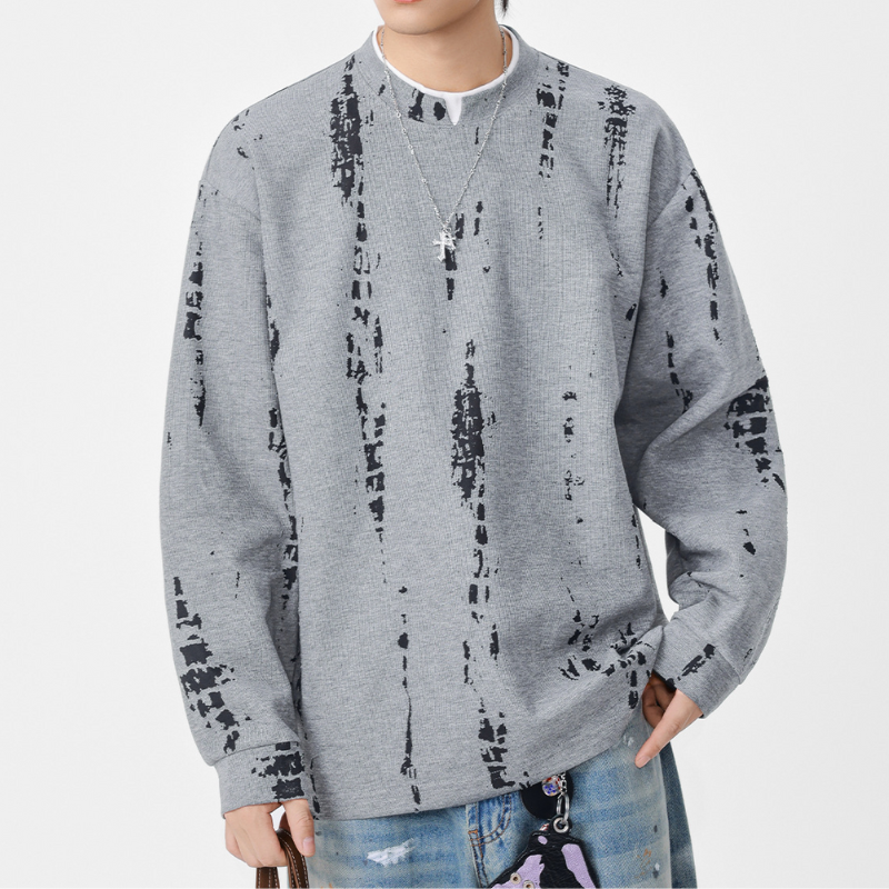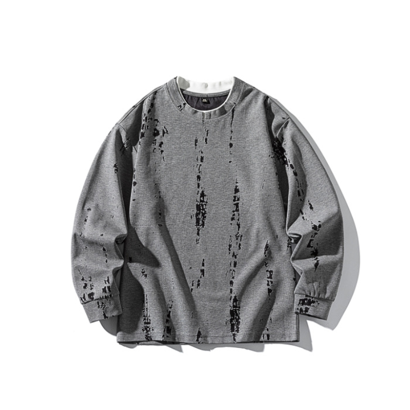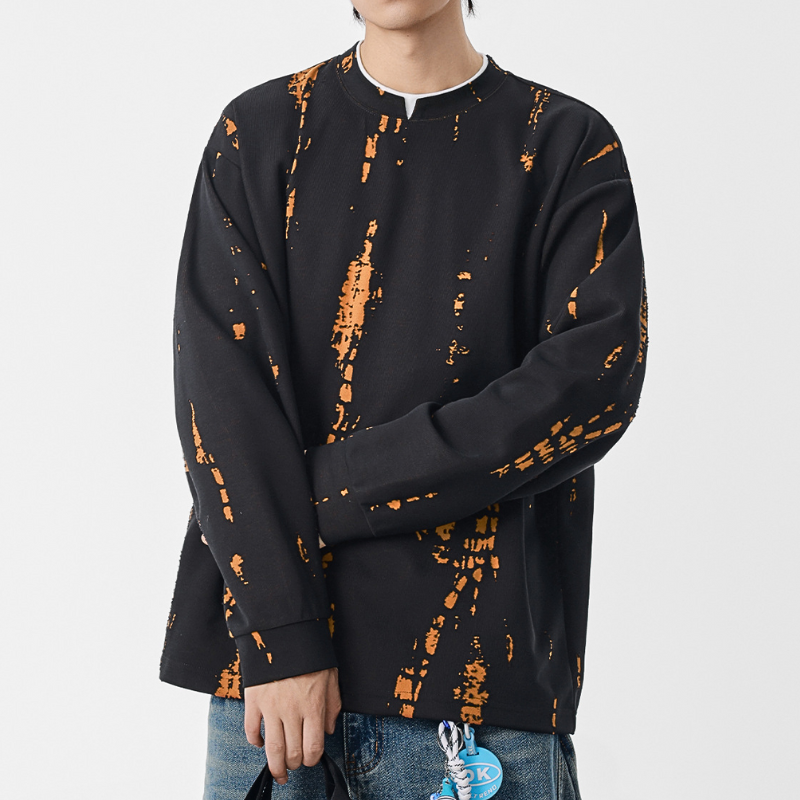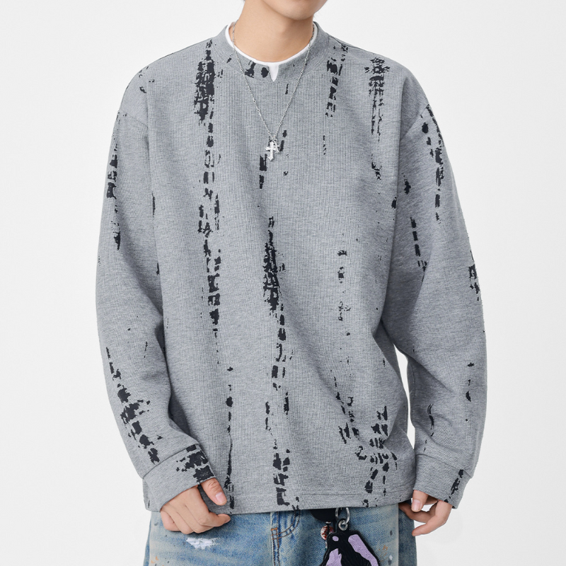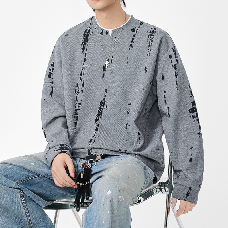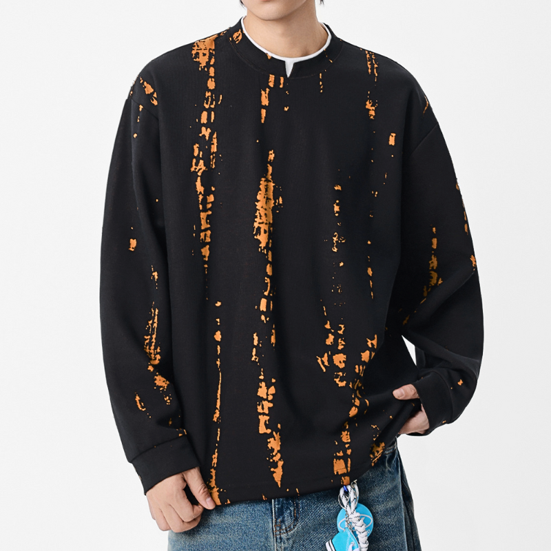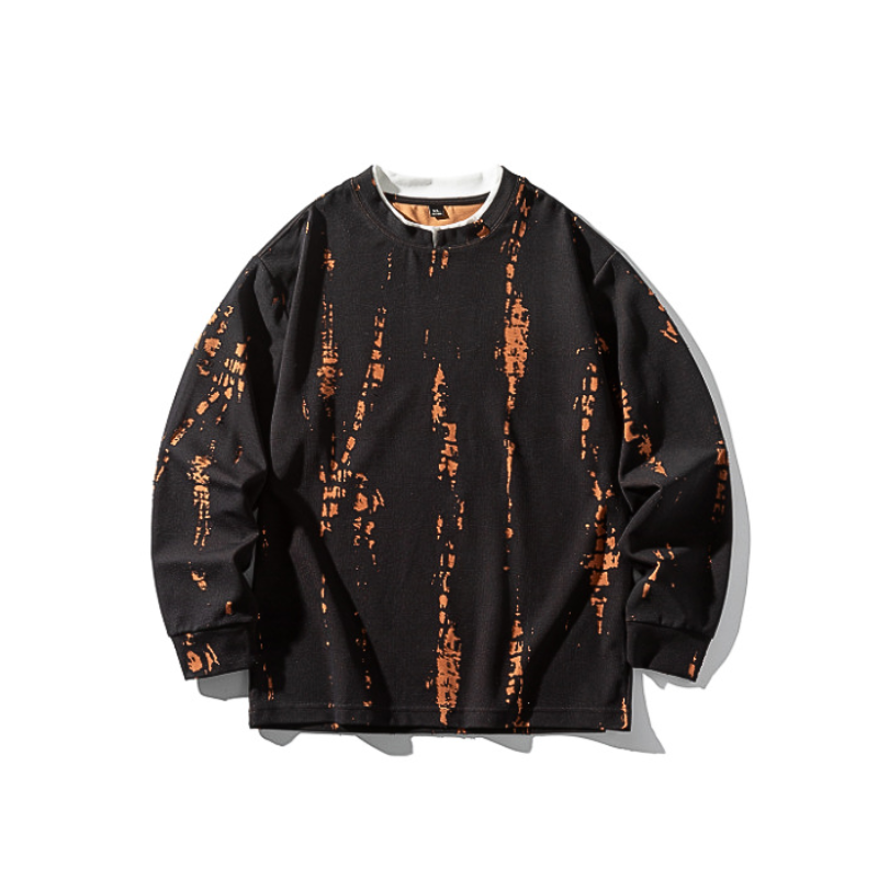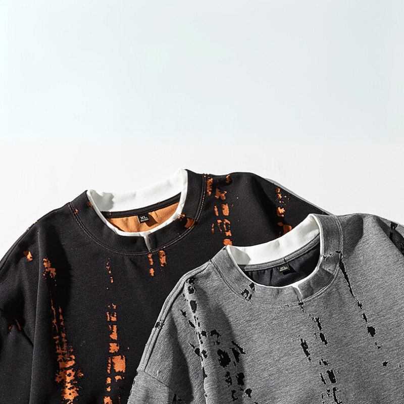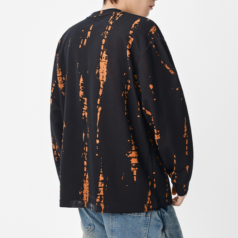 Oversized and relaxed, this sweatshirt carries a moody edge with distressed vertical streaks. In black and orange it channels autumn firelight, while in grey and black it leans into cool, shadowed tones.